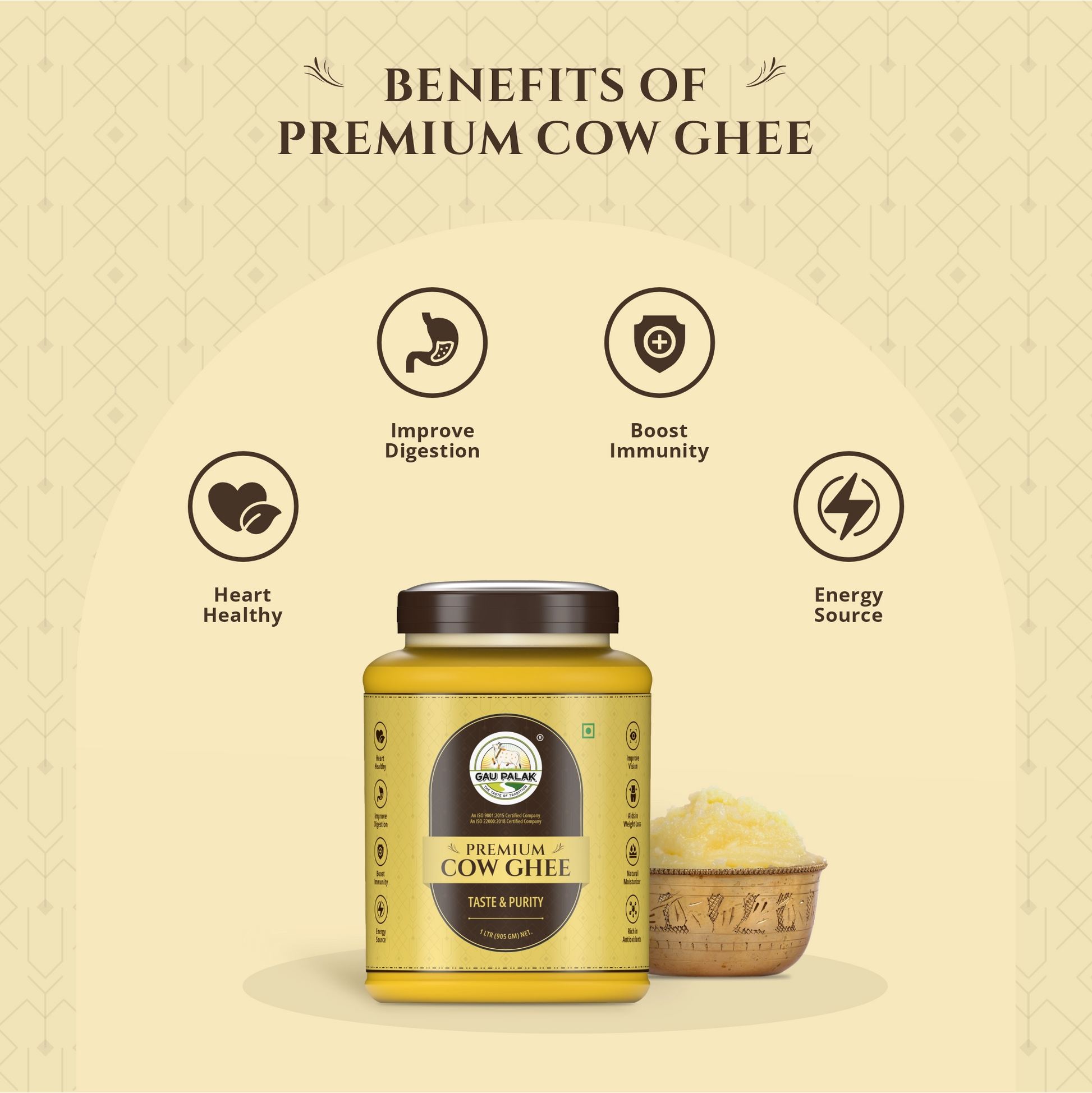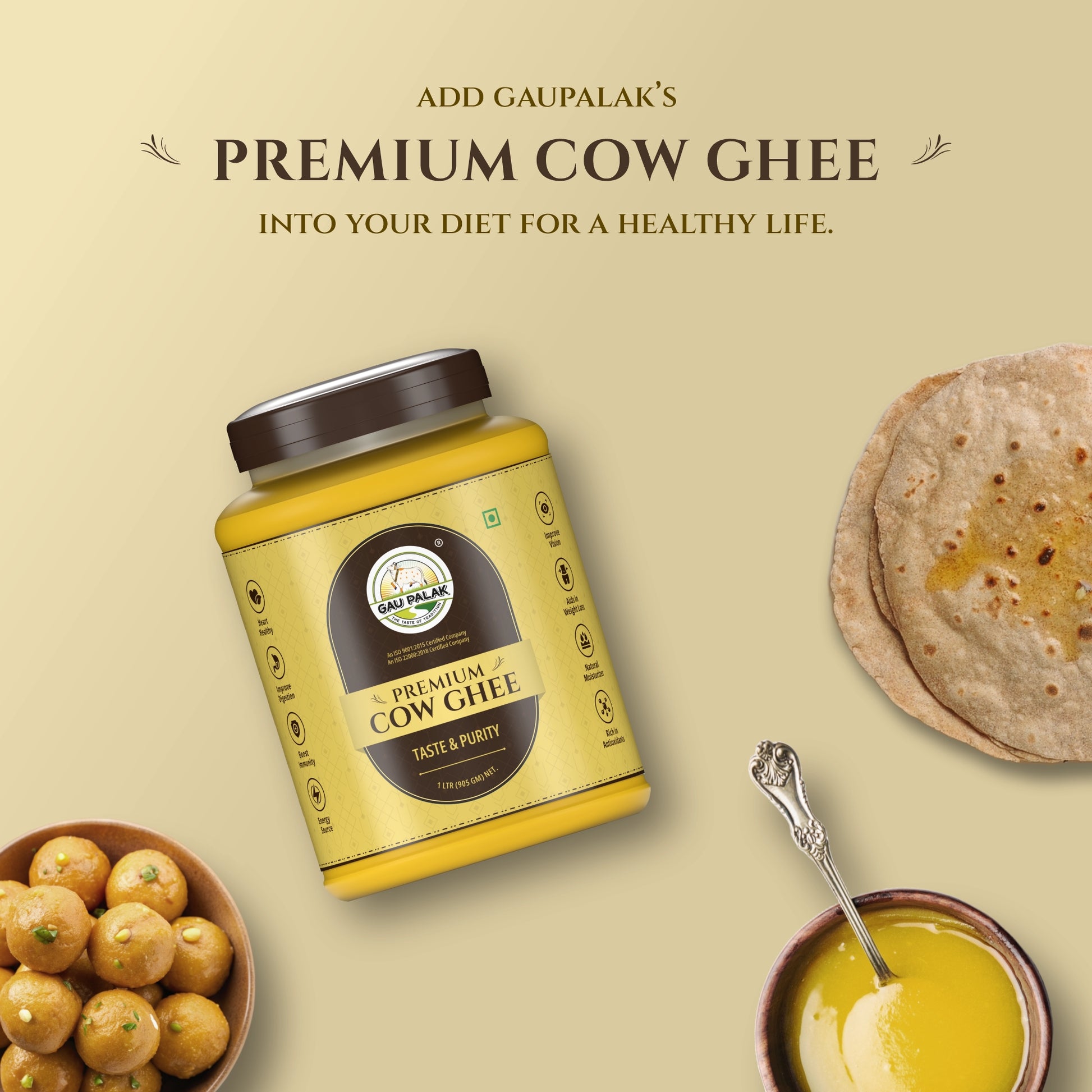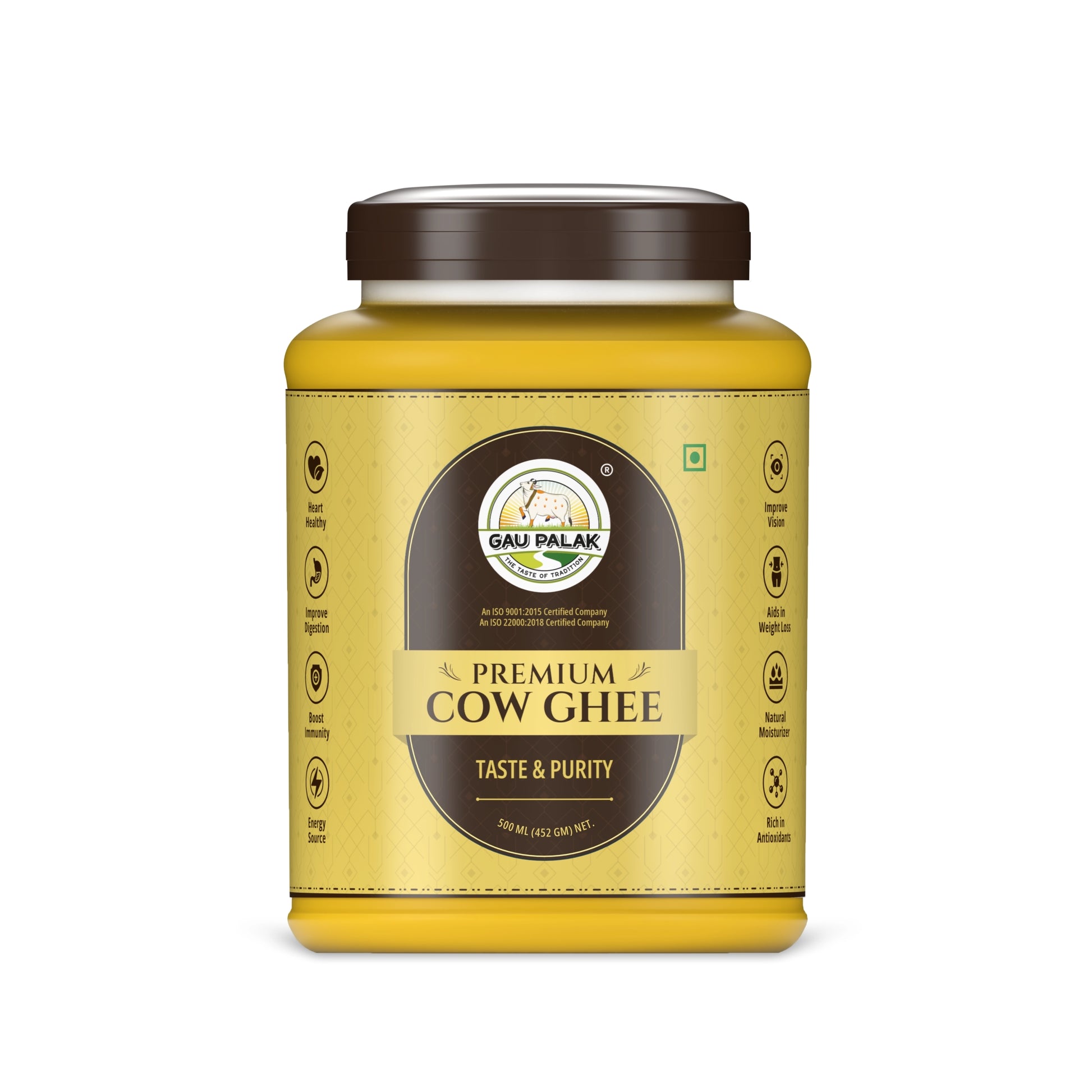 Gaupalak Premium Cow Ghee is a pure, premium ghee made from grass-fed cow's milk using traditional Ayurvedic methods. With a rich aroma, golden color, and high nutritional value, it’s perfect for cooking, rituals, and boosting health with its vitamins, healthy fats, and immunity benefits.